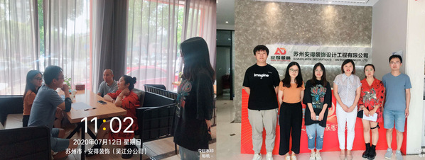 7月12日上午两位老师继续走访了位于吴江区仲英大道的安得装饰,企业导师刘派、胡耿耿参加了本次走访交流活动。在交流中企业导师首先表达了对我校学生工作态度与工作能力的赞赏,重点指出环艺系学生在软件实操、团队合作、任务执行等方面的突出优势,非常认同环艺系“专本衔接企业学院”模式,认为该模式不仅能够提升学生的专业素养,合理管理时间,同时能够给企业带来价值,实现互惠共赢。由于最近企业项目较多,企业导师经常带领学生前往工地或谈客户,学生不仅没有怨言,反而表示学到了很多在校期间未接触过的实践知识,良好的实习表现促使企业导师明确表示希望环艺系多多推荐学生来实习,愿意与环艺系建立长期的合作关系。与此同时企业导师也提出了一些宝贵的建议,希望学校加强手绘课程的教学与练习,不论软件如何发展,也无法取代手绘在整个设计过程中的地位;同时注重色彩搭配,提升学生的审美能力。此外,企业导师建议在校期间学生尽可能考取驾照,持续学习英语,这两项技能在工作时能够作为加分项。同时也对两位实习生提出要求,希望他们一定要扎实基础,虚心学习,勤于思考,在企业中更快成长。