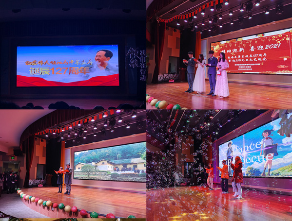 12月28日17:00环境艺术工程系全体住宿生和老师齐聚报告厅,隆重举行“辞旧迎新,绽放2021”——纪念毛泽东诞辰127周年暨迎元旦文艺晚会。