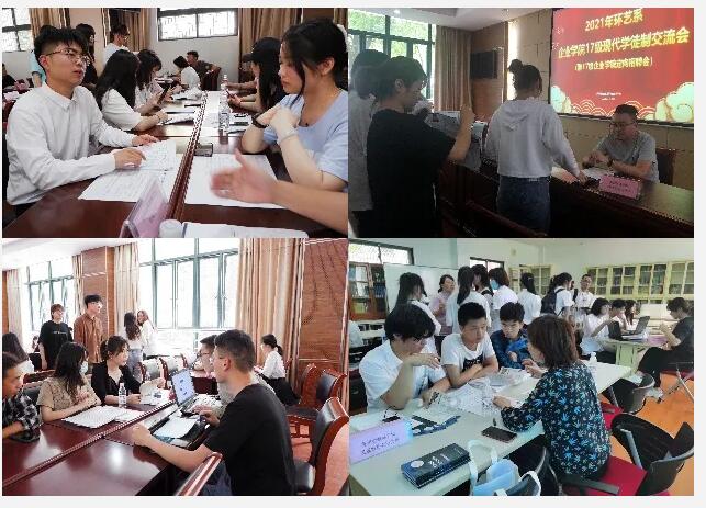 第三个议程是师徒交流、招聘意向交流阶段,按照系的统筹安排,一个学生最多面试三个企业。本次招聘会第一个亮点就是已经毕业、担任企业门店经理和设计部主任的学生作为主要面试官,学生同学们纷纷将自己四年以来的作品给企业和学长进行了交流与展示。第二个亮点就是大型装饰企业较多,金螳螂建筑、金螳螂文化、筑园景观等负责人亲自参与面试,经过一个半小时的交流,各企业现场确定了意向学生名单。