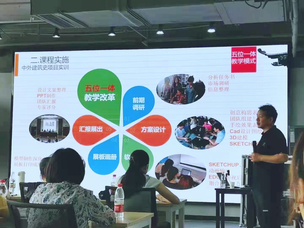 下午陈主任主要从《中外建筑赏析与实训》、《课证合一的课程改革》几门课程,按照环艺系的“五位一体”教学模式详细分析了如何将各门课程进行横向和纵向的融合,运用项目贯穿每一门课程的始终,对于锻炼职业教育学生的综合实践能力有什么重要影响进行了论述。