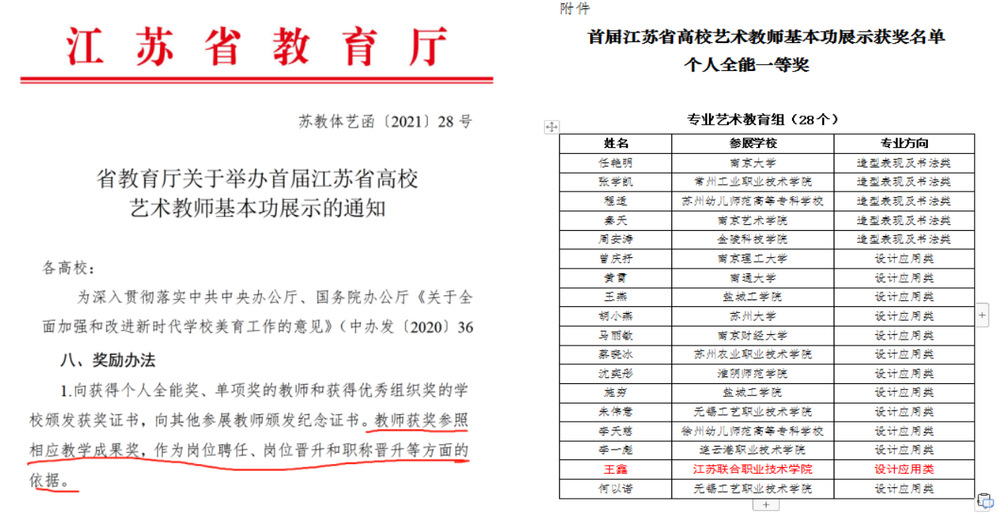 我系青年骨干教师王鑫代表江苏联合职业技术学院参加了专业艺术教育组的教学展示(微课)、专业技能展示、审美和人文素养展示(经典作品赏析)三个项目的竞赛,备赛以来,江苏联院艺术设计教指委秘书长、学校领导和环艺系高度重视,从各个方面进行备赛的保障工作。最终获得获得设计应用类个人全能一等奖,为江苏联合职业技术学院和我校增光添彩!!也是环境艺术工程系自7月份生职业学校教学大赛三项一等奖、11月底杨晶晶老师在第七届家电家装被一等奖第一之后又一次获得的江苏省高校最高级别的奖项!!