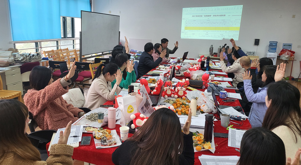 教务管理员许松老师宣读2021年环艺系积分考核条例,全体教师针对环境艺术工程系《环艺系优秀教师积分考核表》和《环艺系年度考核优秀积分考核表》的各项条目展开讨论和反复的协商,最终举手表决通过《环境艺术工程系2022年评先评优积分考核条例》,2022年系部所有工作考核将严格按考核表罗列的内容进行积分管理力争做到评选的公平公正。