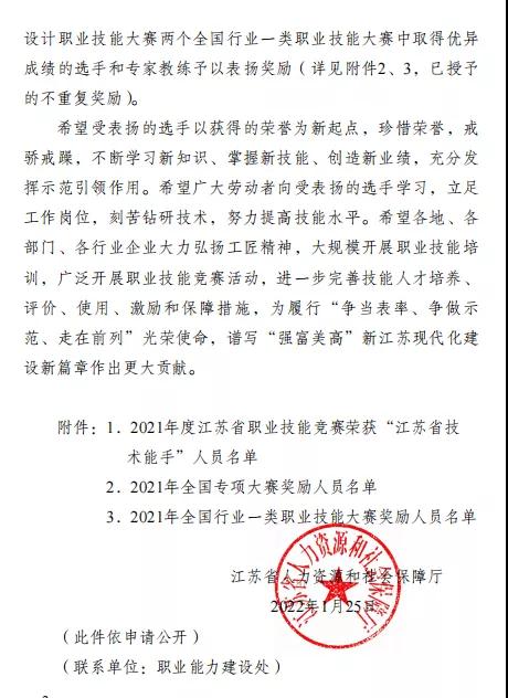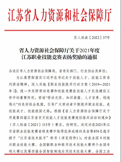 1月25号江苏省人力资源社会保障厅发文,决定对在2021年江苏省职业技能竞赛省级竞赛中取得优异成绩的选手授予“江苏省技术能手”称号。“方太幸福家杯”第七届江苏省家电家装职业技能大赛的12名优胜专业选手荣获了江苏省人力资源社会保障厅授予的“江苏省技术能手”称号。我系杨晶晶、曾慧颖两位老师一路过关斩将,双获殊荣。