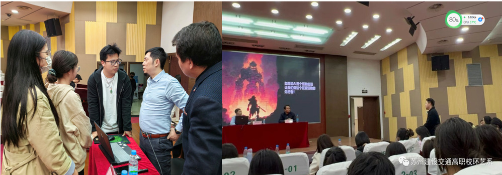 徐总首先向师生简要介绍了AI在各行业中的运用效果,特别是在讲到AI在室内设计行业中的应用情况,结合自身的经验和案例,深入探讨了AI对室内设计专业的影响。通过大量的自我研究和企业实际运用案例数据的呈现,专家将AI与室内设计相结合,用通俗易懂的方式讲解了AI技术的强大影响力,为同学们呈现了一个全新的未来视角。