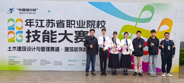 2026年4月10日至12日,2026年江苏省职业院校技能大赛高职组建筑装饰数字化施工赛项在南通职业大学举行,全省共27所职业院校参与角逐,最终我校环境艺术工程学院杨超、薛刘升老师指导的设计21402班王泽韬、设计22401班蔡姗闻、设计22401班夏一涵取得一等奖第一名的成绩,为学校再添一金。